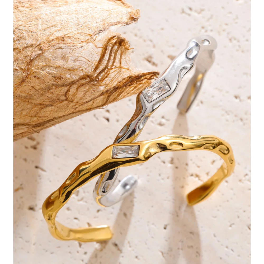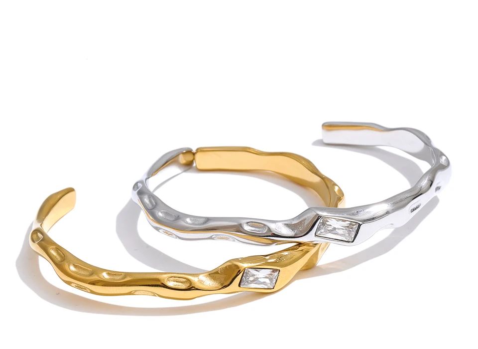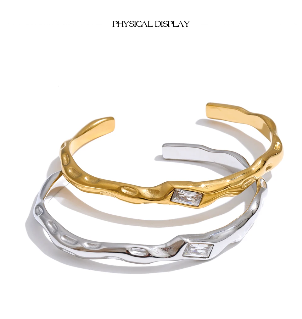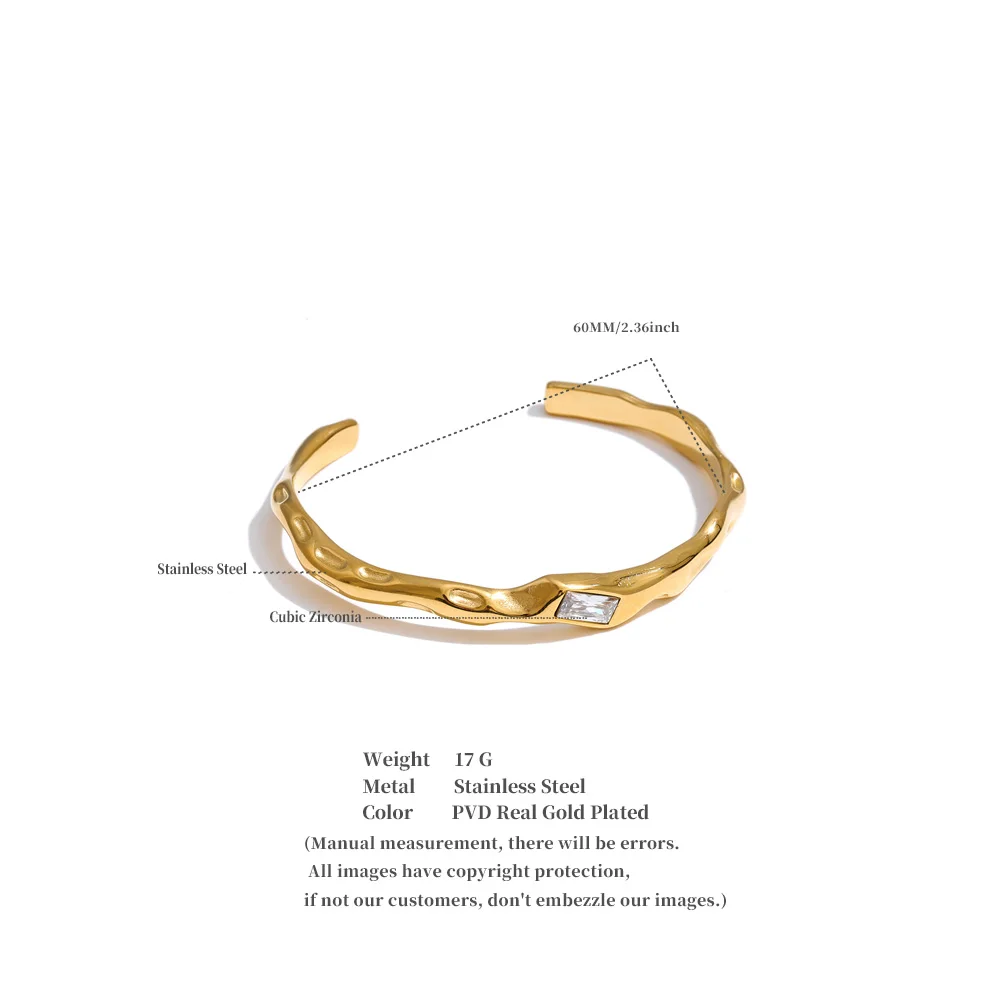 Crafted from high-quality stainless steel and finished with durable PVD gold plating, it is hypoallergenic, waterproof, and resistant to tarnish—made for confident everyday wear. The open cuff design offers a comfortable fit while maintaining a strong, architectural presence on the wrist.