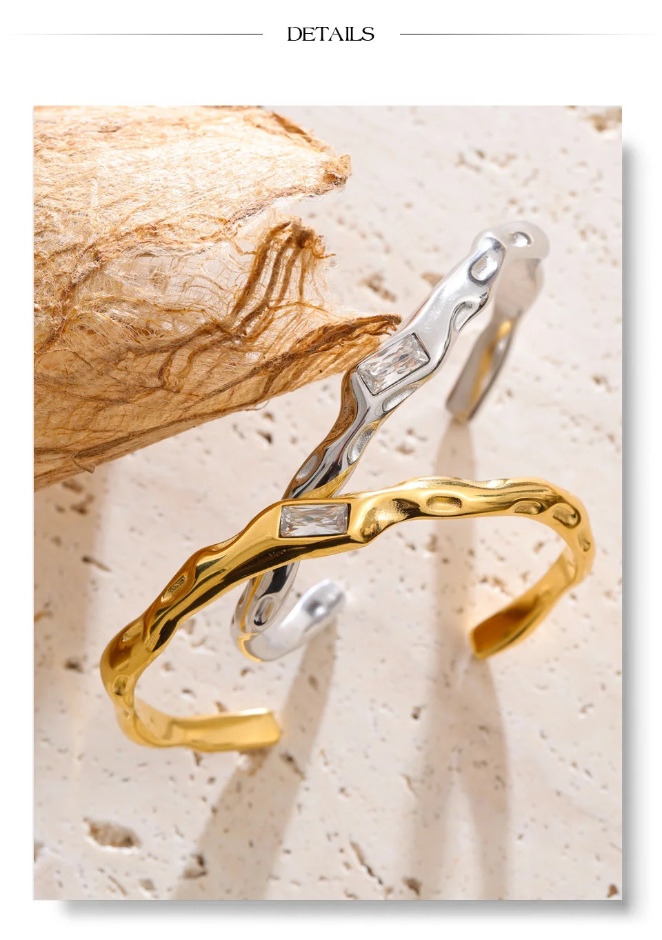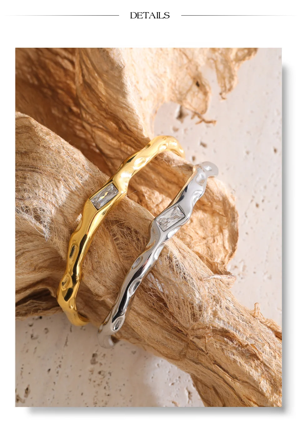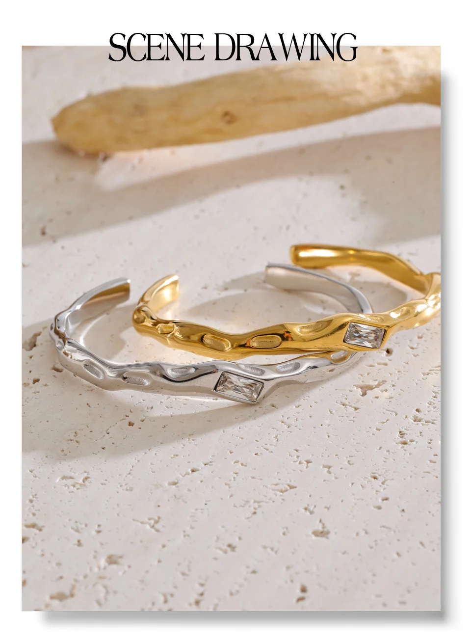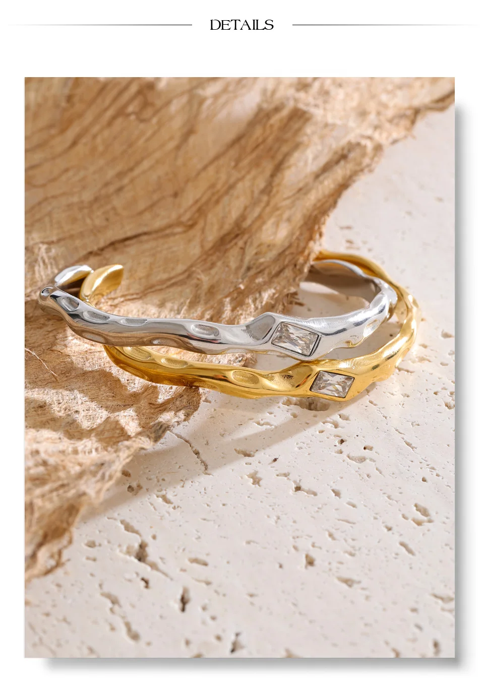 Crafted from high-quality stainless steel and finished with durable PVD gold plating, it is hypoallergenic, waterproof, and resistant to tarnish—made for confident everyday wear. The open cuff design offers a comfortable fit while maintaining a strong, architectural presence on the wrist.