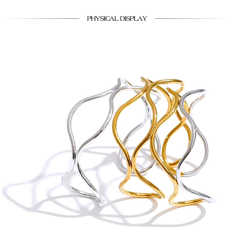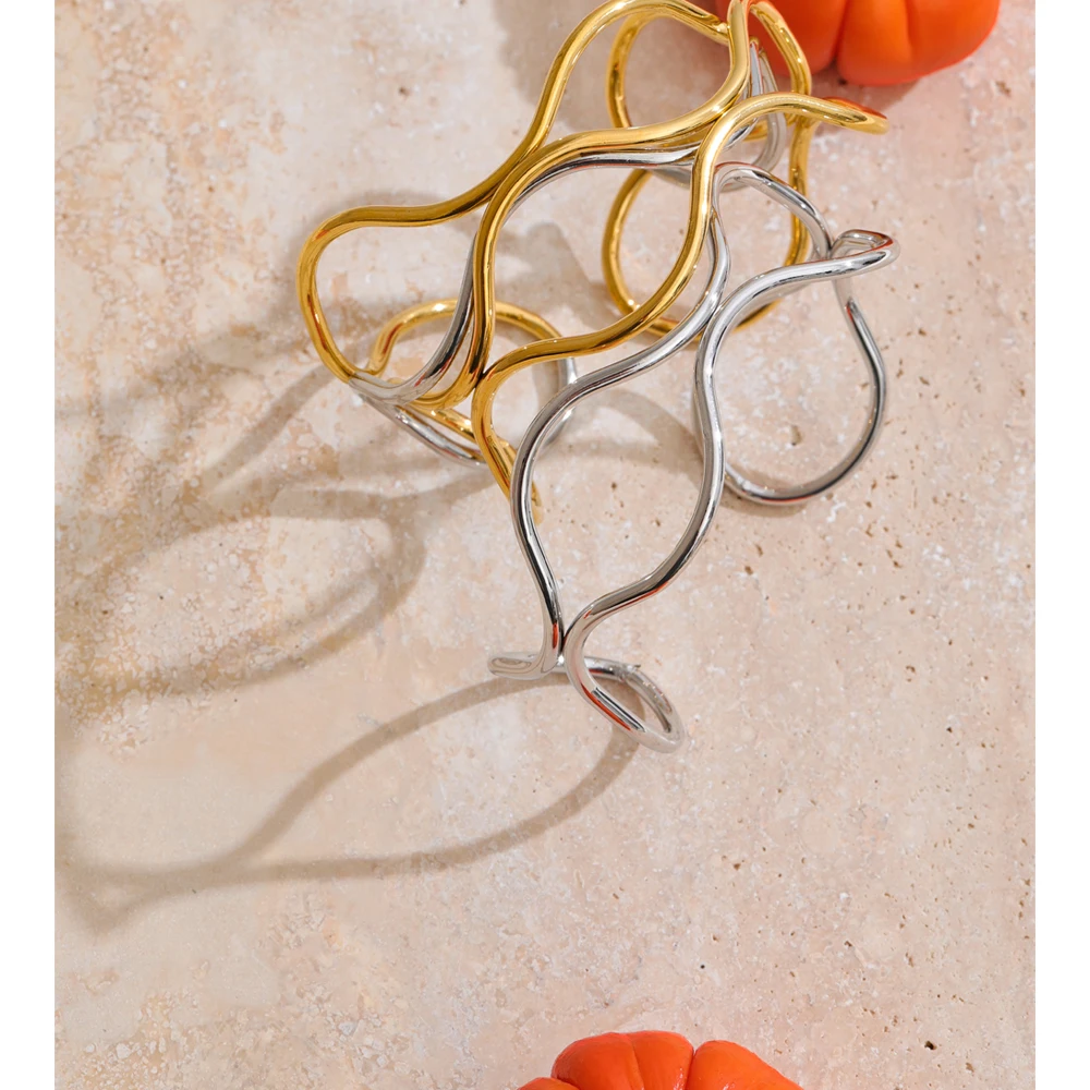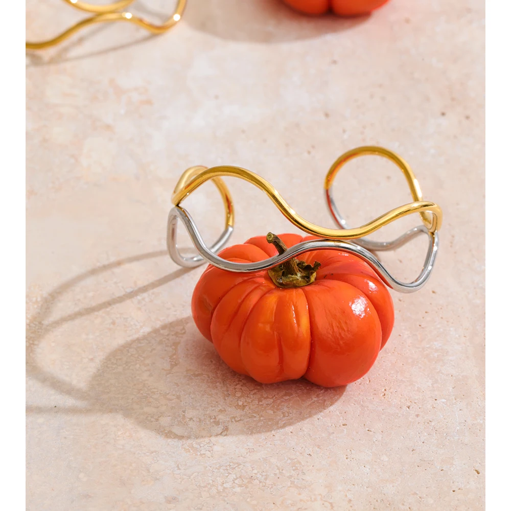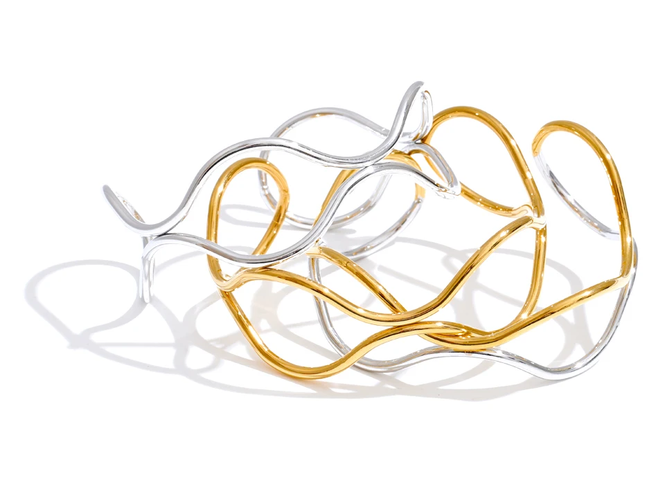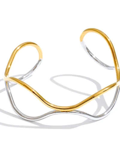 Crafted from durable stainless steel and finished with radiant PVD plating, this waterproof cuff offers lasting brilliance and resistance to tarnish. The hollow double-layer design allows light to pass through, enhancing its airy presence while emphasizing the fluid contrast between the two luminous tones.