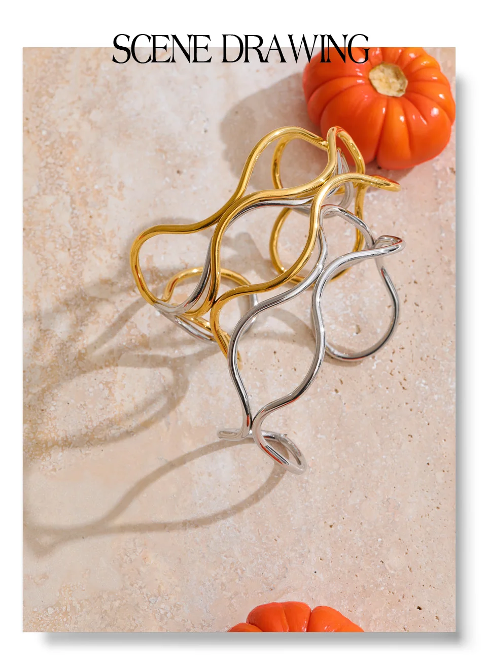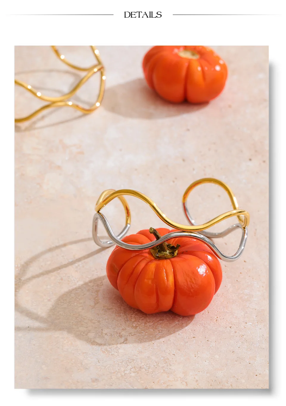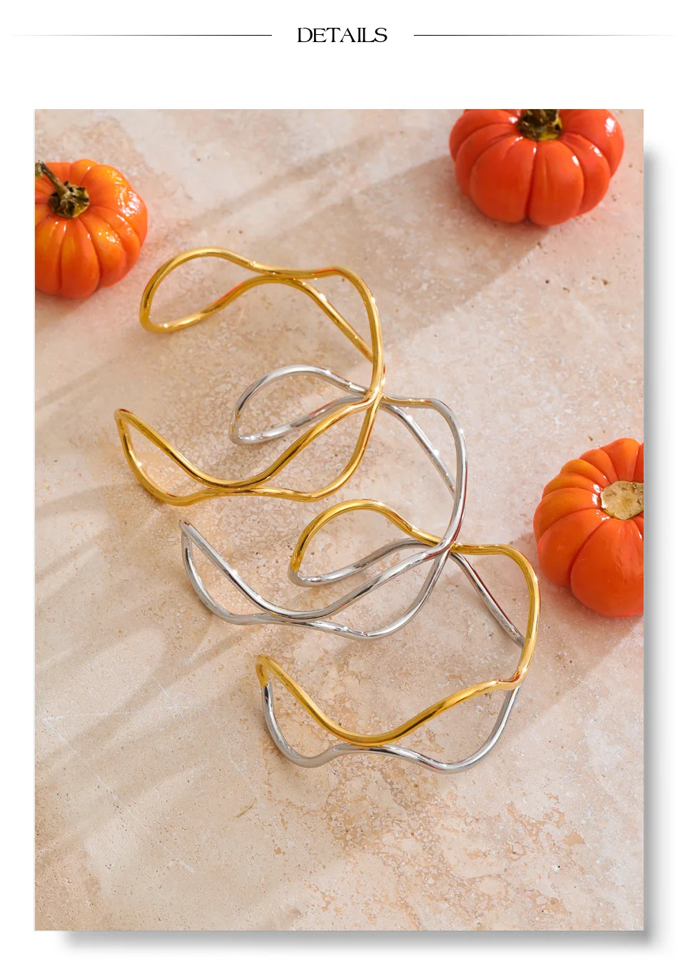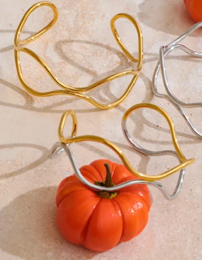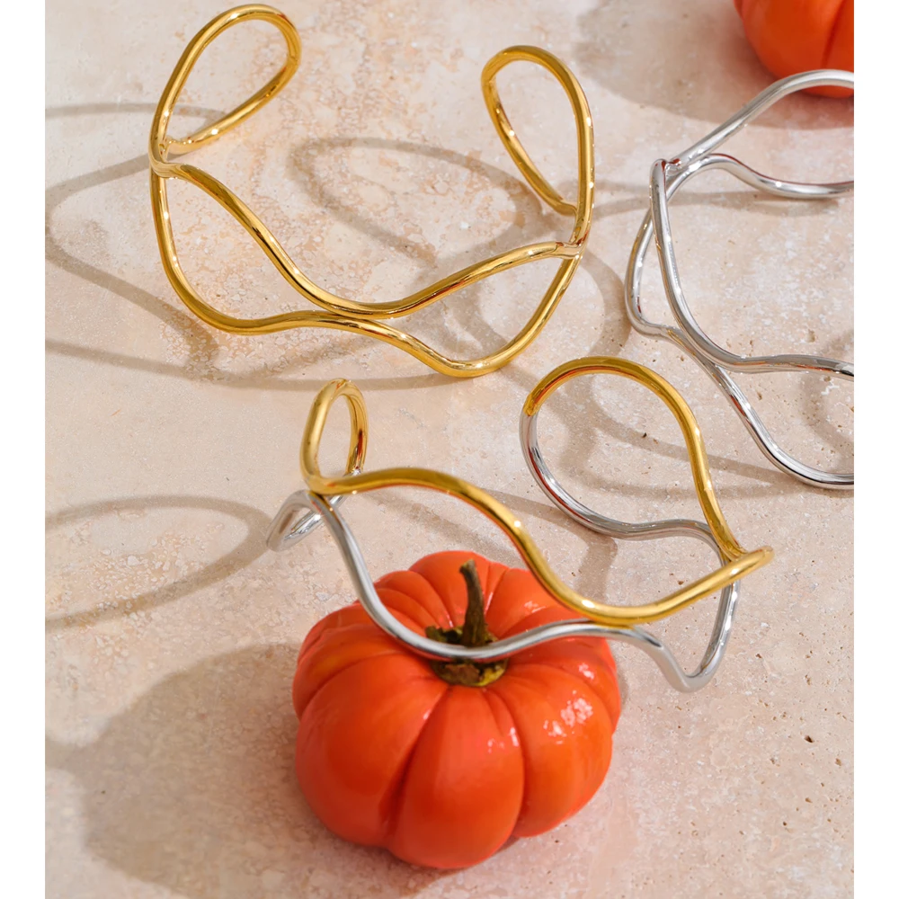 Crafted from durable stainless steel and finished with radiant PVD plating, this waterproof cuff offers lasting brilliance and resistance to tarnish. The hollow double-layer design allows light to pass through, enhancing its airy presence while emphasizing the fluid contrast between the two luminous tones.