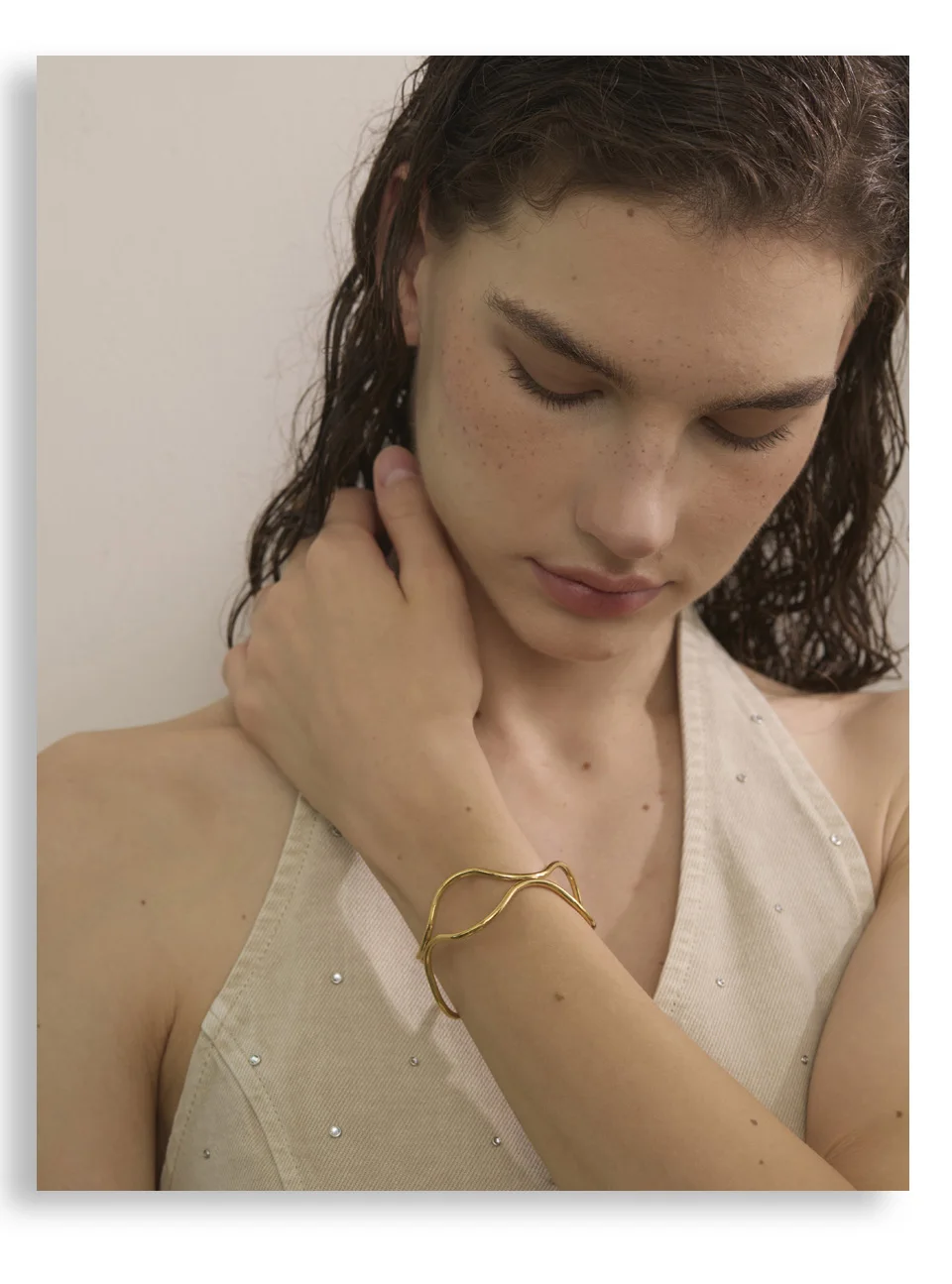 Minimal yet expressive, the layered contours create depth without weight. The open silhouette wraps the wrist with gentle structure, where warmth meets clarity and gold meets platinum in refined balance.