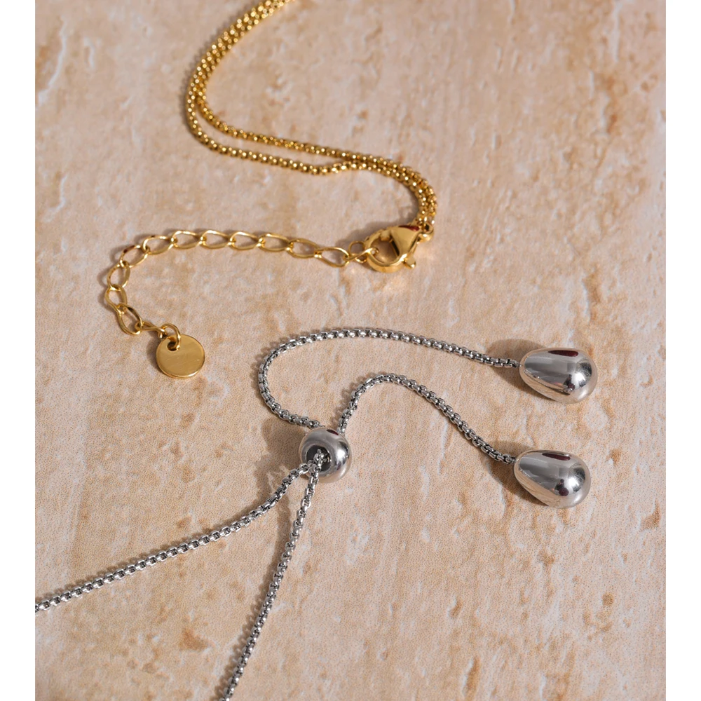 Striking in its simplicity, the Gold Flow Drop Necklace – Subtle Allure embodies contemporary elegance with a refined aesthetic. Its retractable chain design allows for adjustable length, creating a fluid drop silhouette that moves gracefully with every step.