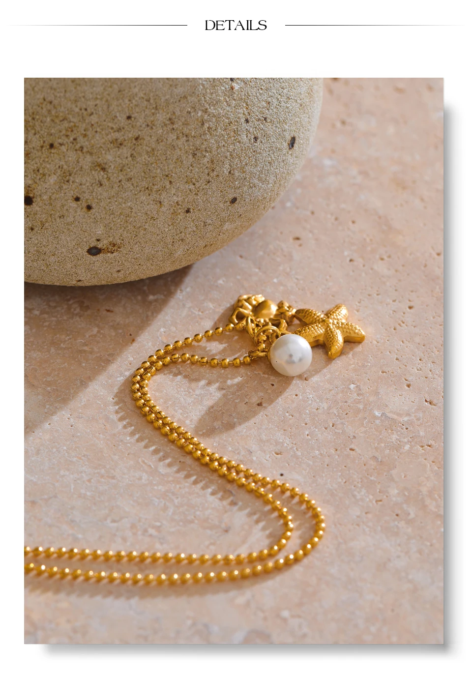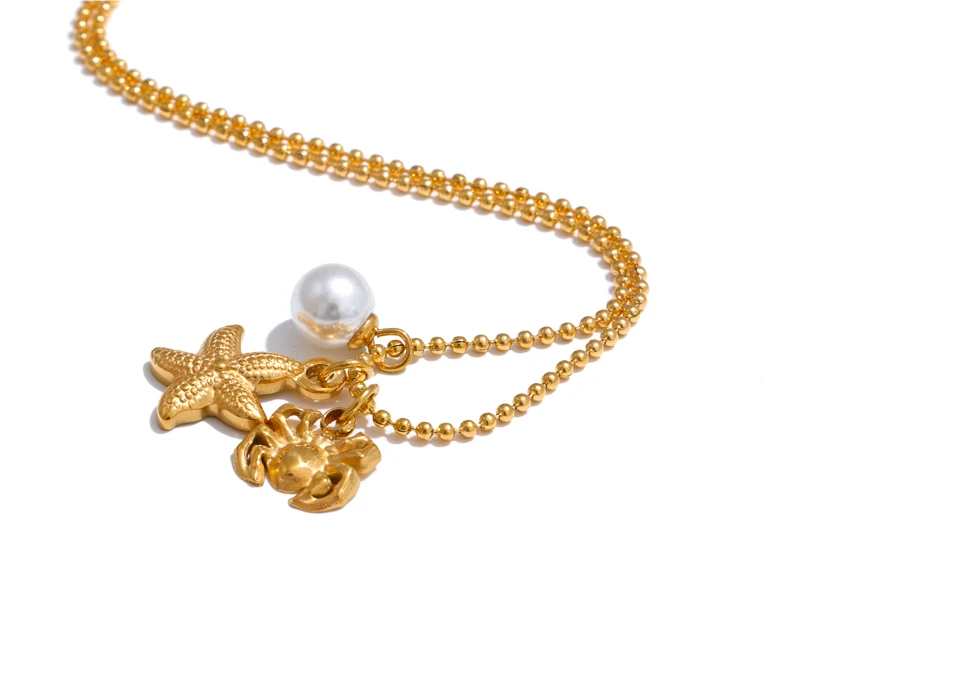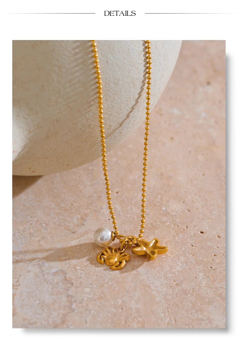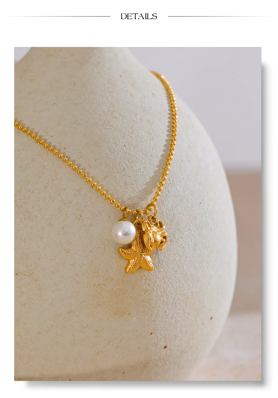 Celebrate the magic of the sea with the Sea Treasure Necklace – Beach Joy. This charming pendant necklace brings together whimsical ocean motifs—a starfish, a delicate crab, and lustrous simulated pearls—for a playful yet sophisticated statement.