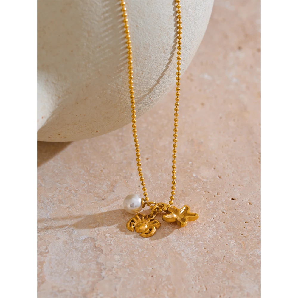 Celebrate the magic of the sea with the Sea Treasure Necklace – Beach Joy. This charming pendant necklace brings together whimsical ocean motifs—a starfish, a delicate crab, and lustrous simulated pearls—for a playful yet sophisticated statement.