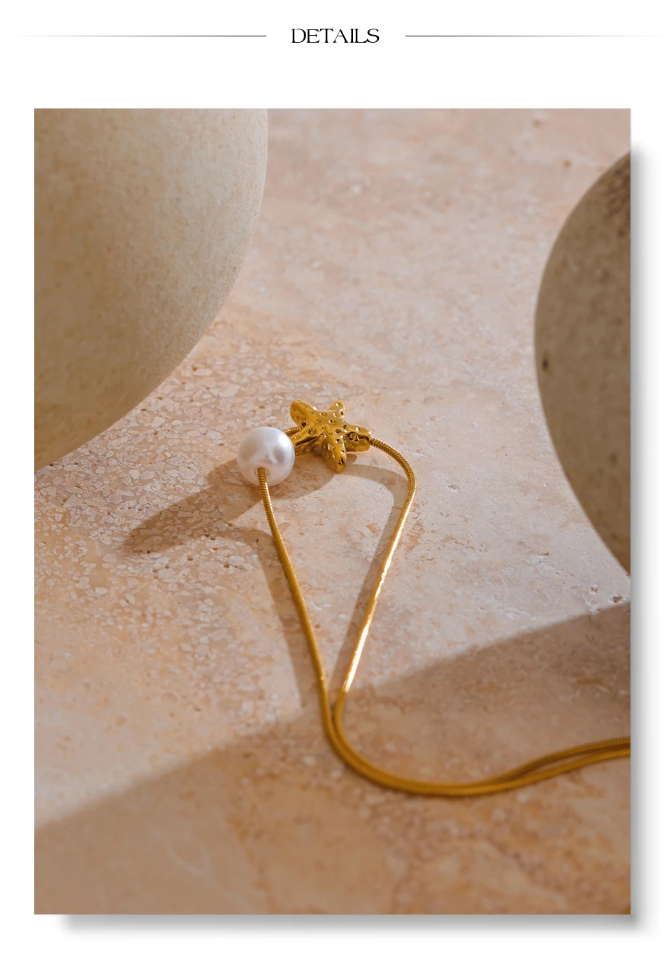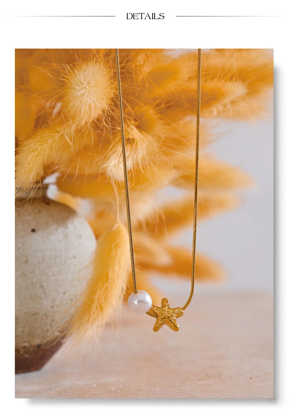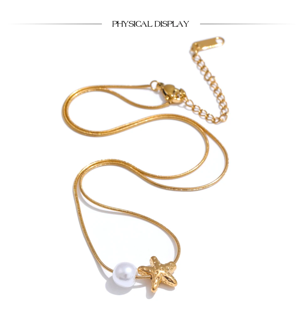 A versatile, elegant necklace featuring a star-shaped shell and simulated pearl drop. Crafted in stainless steel with PVD gold plating, lightweight and perfect for everyday or special occasions.