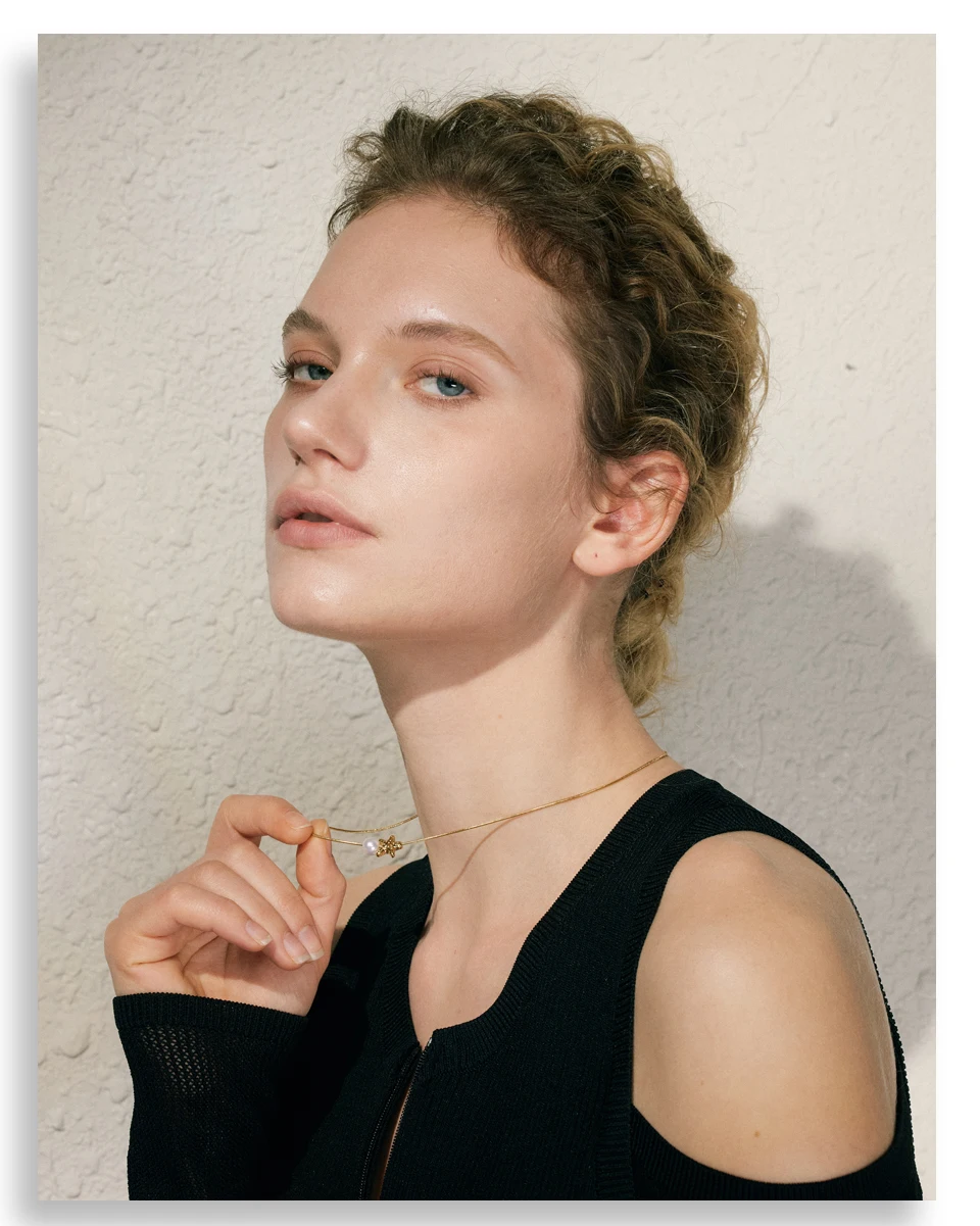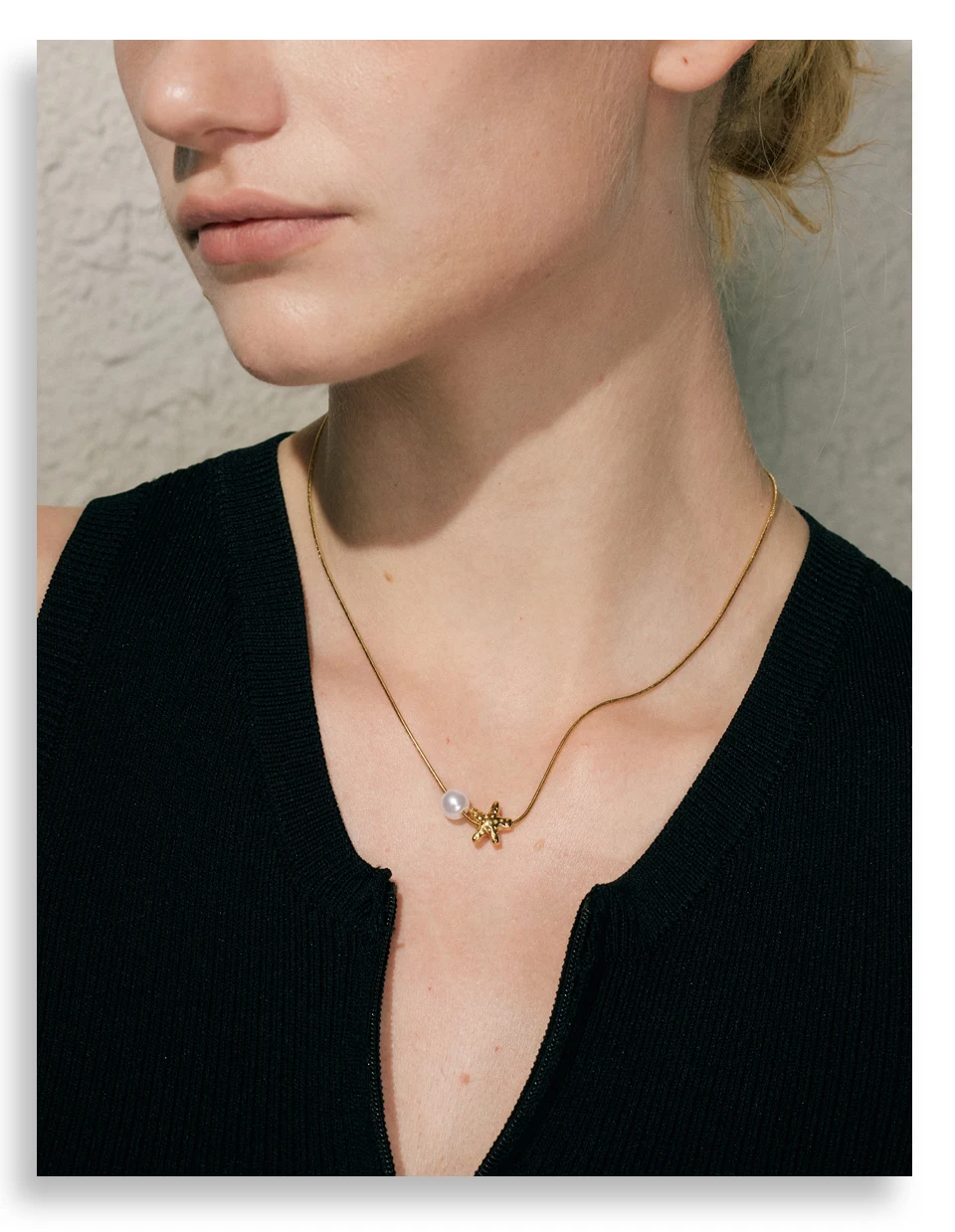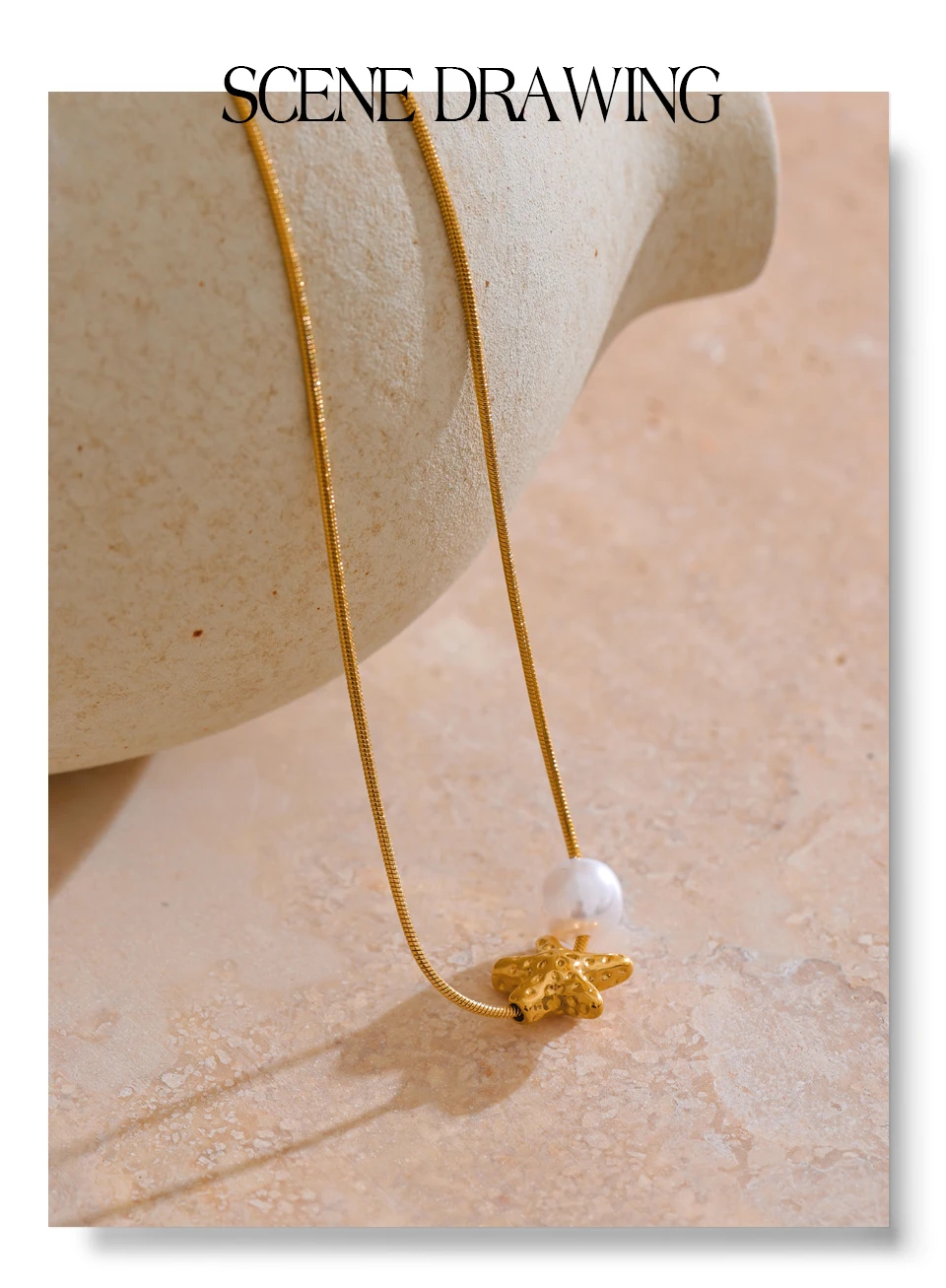 A versatile, elegant necklace featuring a star-shaped shell and simulated pearl drop. Crafted in stainless steel with PVD gold plating, lightweight and perfect for everyday or special occasions.