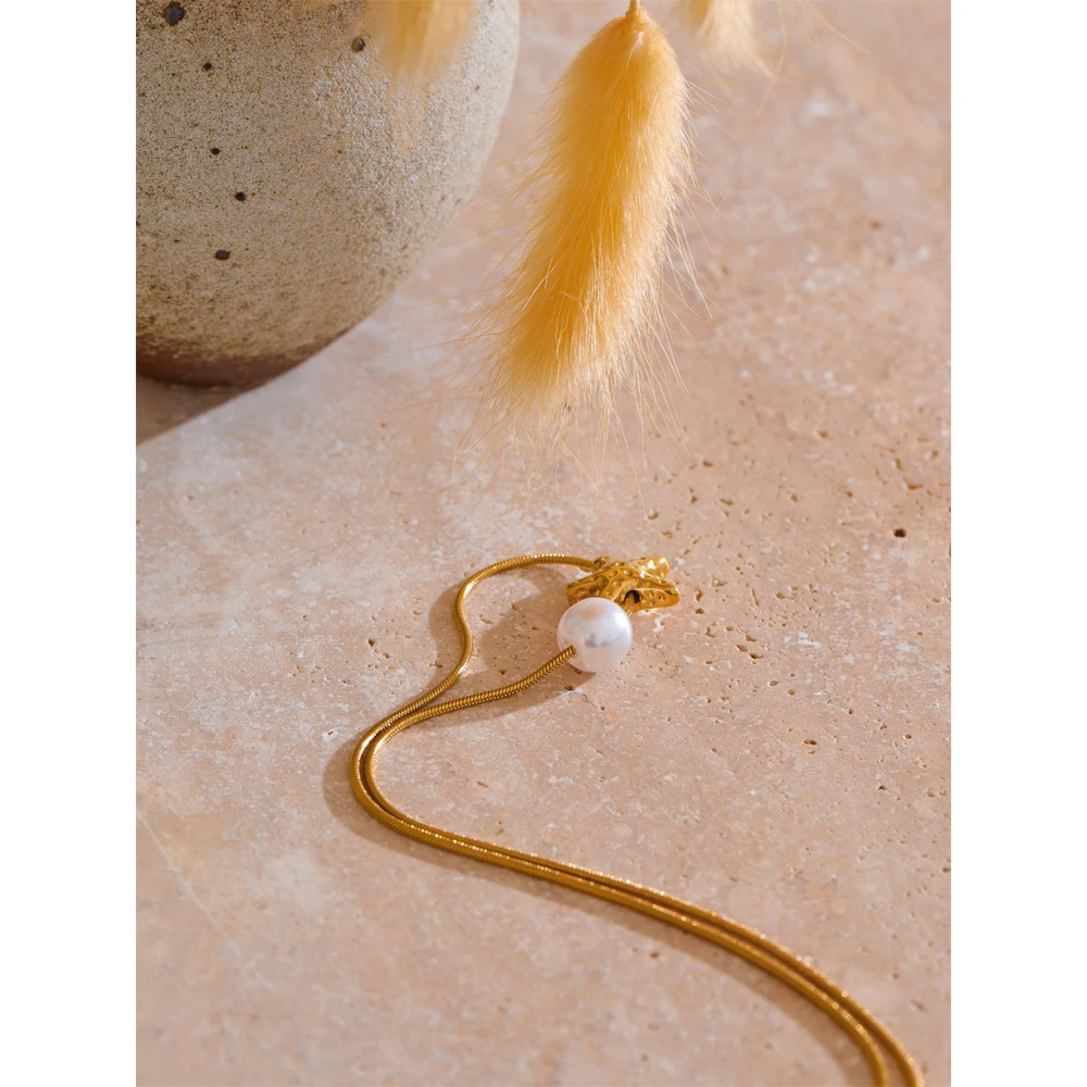 A versatile, elegant necklace featuring a star-shaped shell and simulated pearl drop. Crafted in stainless steel with PVD gold plating, lightweight and perfect for everyday or special occasions.