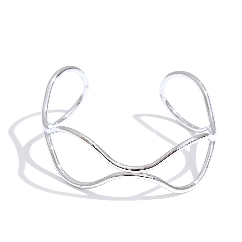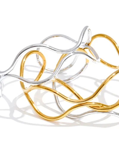 Crafted from durable stainless steel and coated in radiant 16K PVD plating, this waterproof cuff offers lasting brilliance and resistance to tarnish. The hollow double-layer design allows light to pass through, enhancing its airy presence and emphasizing its fluid contour.