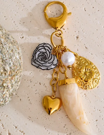 The Golden Garden of Love Keychain – City Poetry is designed for those who appreciate expressive details and contemporary design. Its combination of resin flower, heart, and horn motifs creates a layered, artistic look that adds visual interest and individuality to everyday essentials.