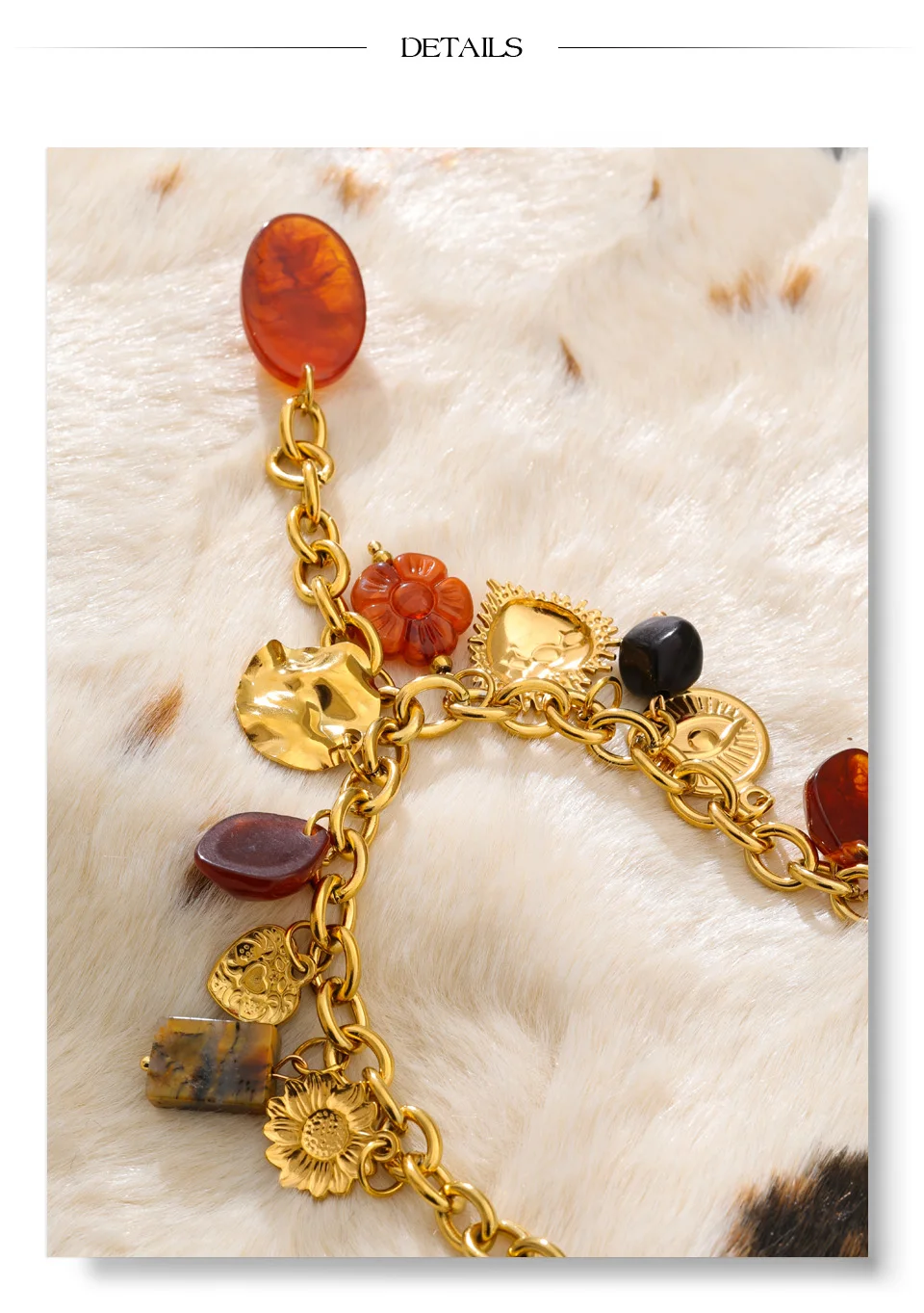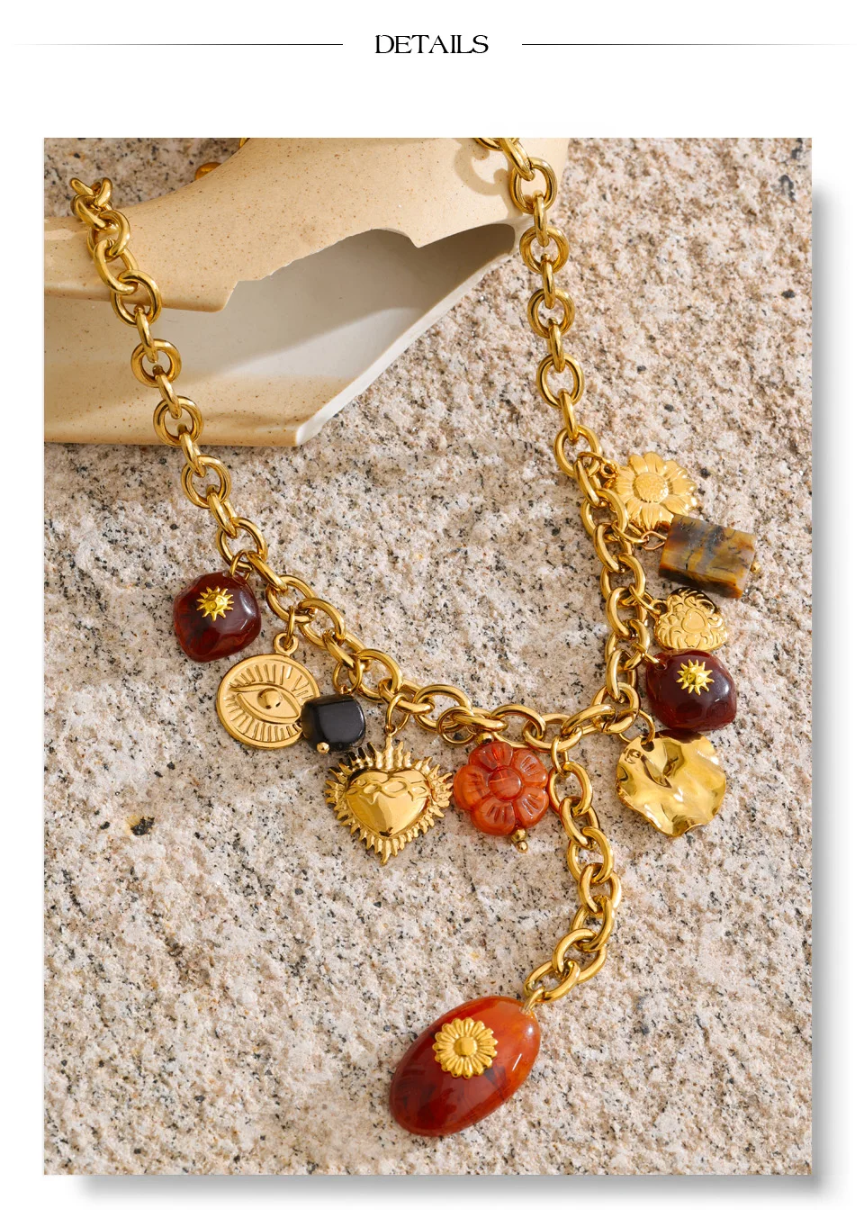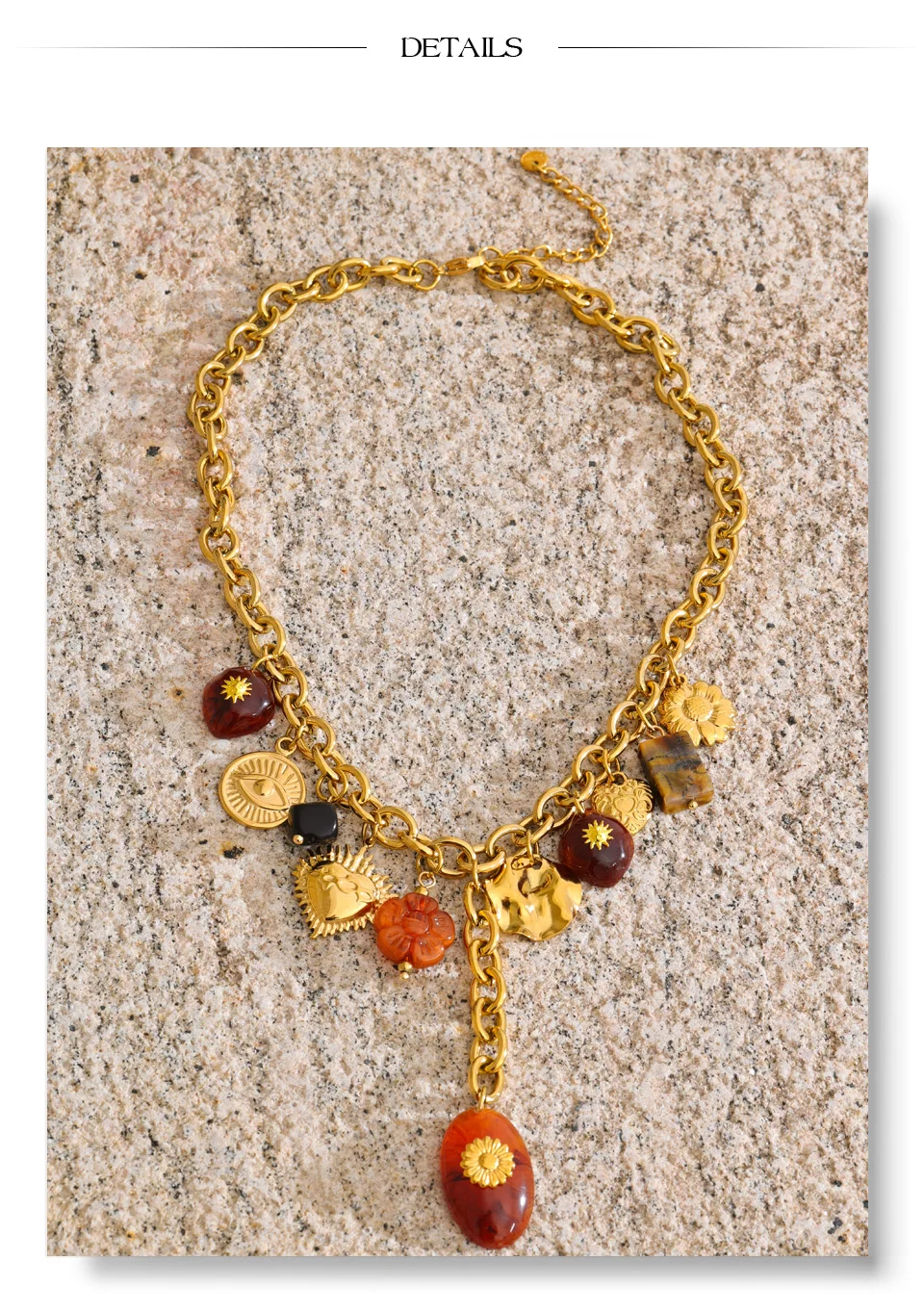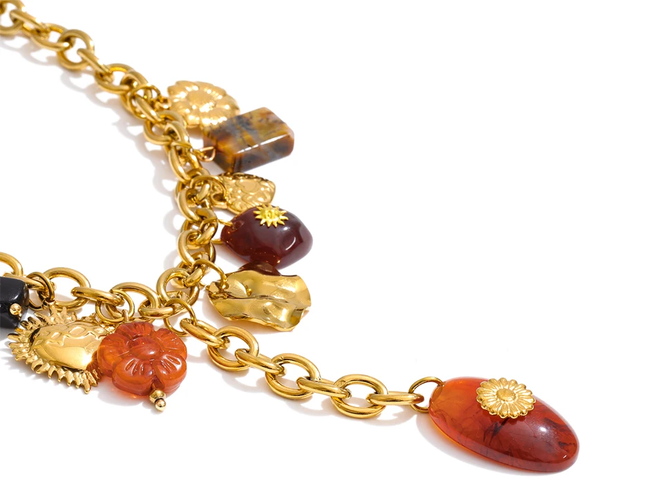 The Autumn Muse Charm Necklace captures seasonal warmth through symbolic design. Featuring handcrafted resin charms in eye, flower, and heart motifs, this gold-tone stainless steel necklace delivers expressive elegance and trend-driven appeal—perfect for autumn and winter statement styling.