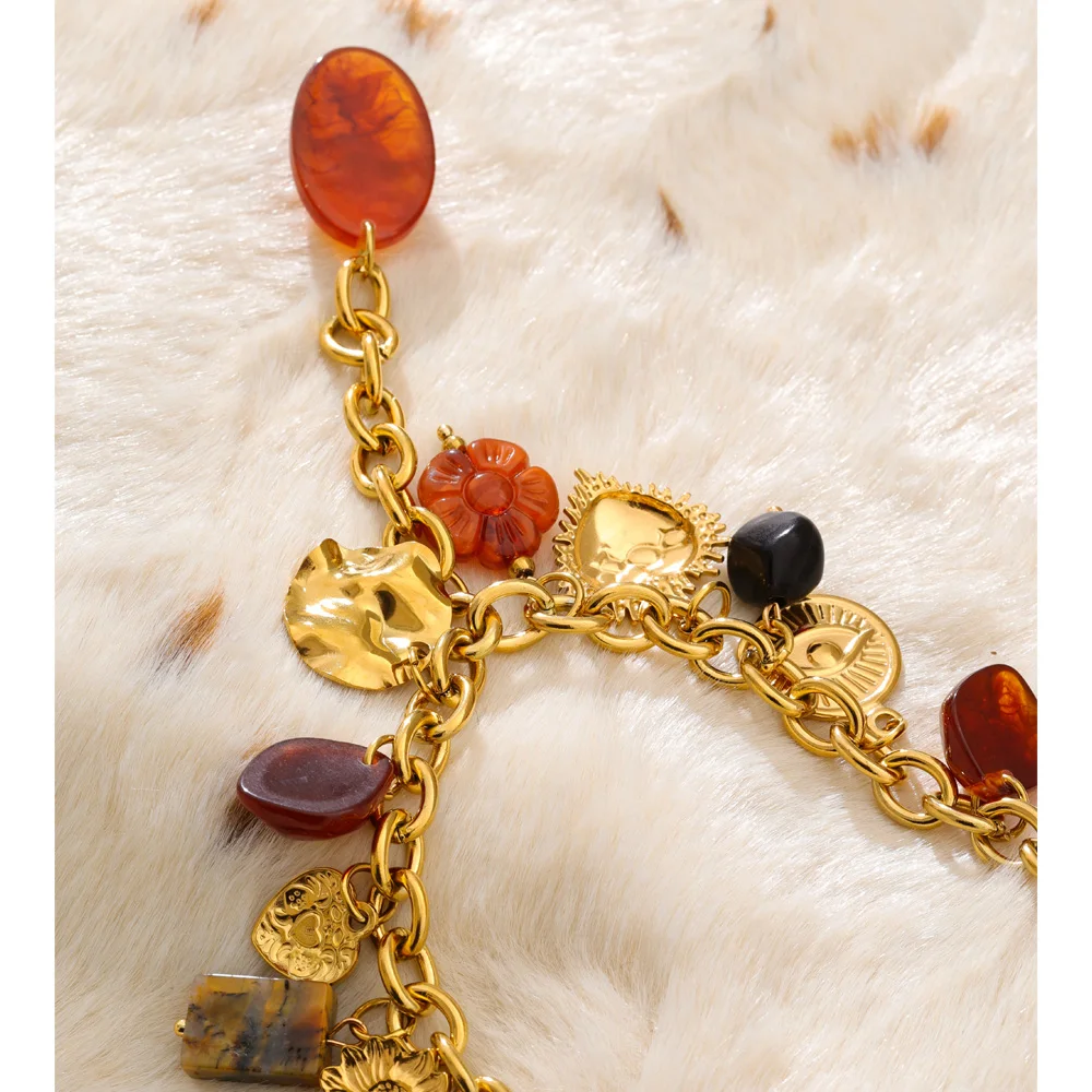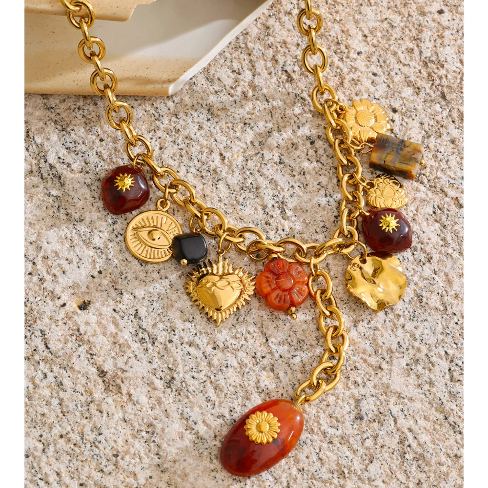 The Autumn Muse Charm Necklace captures seasonal warmth through symbolic design. Featuring handcrafted resin charms in eye, flower, and heart motifs, this gold-tone stainless steel necklace delivers expressive elegance and trend-driven appeal—perfect for autumn and winter statement styling.