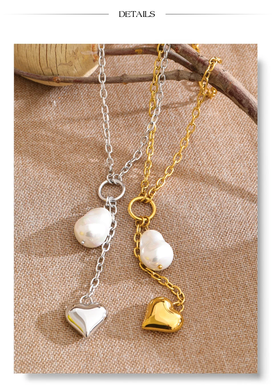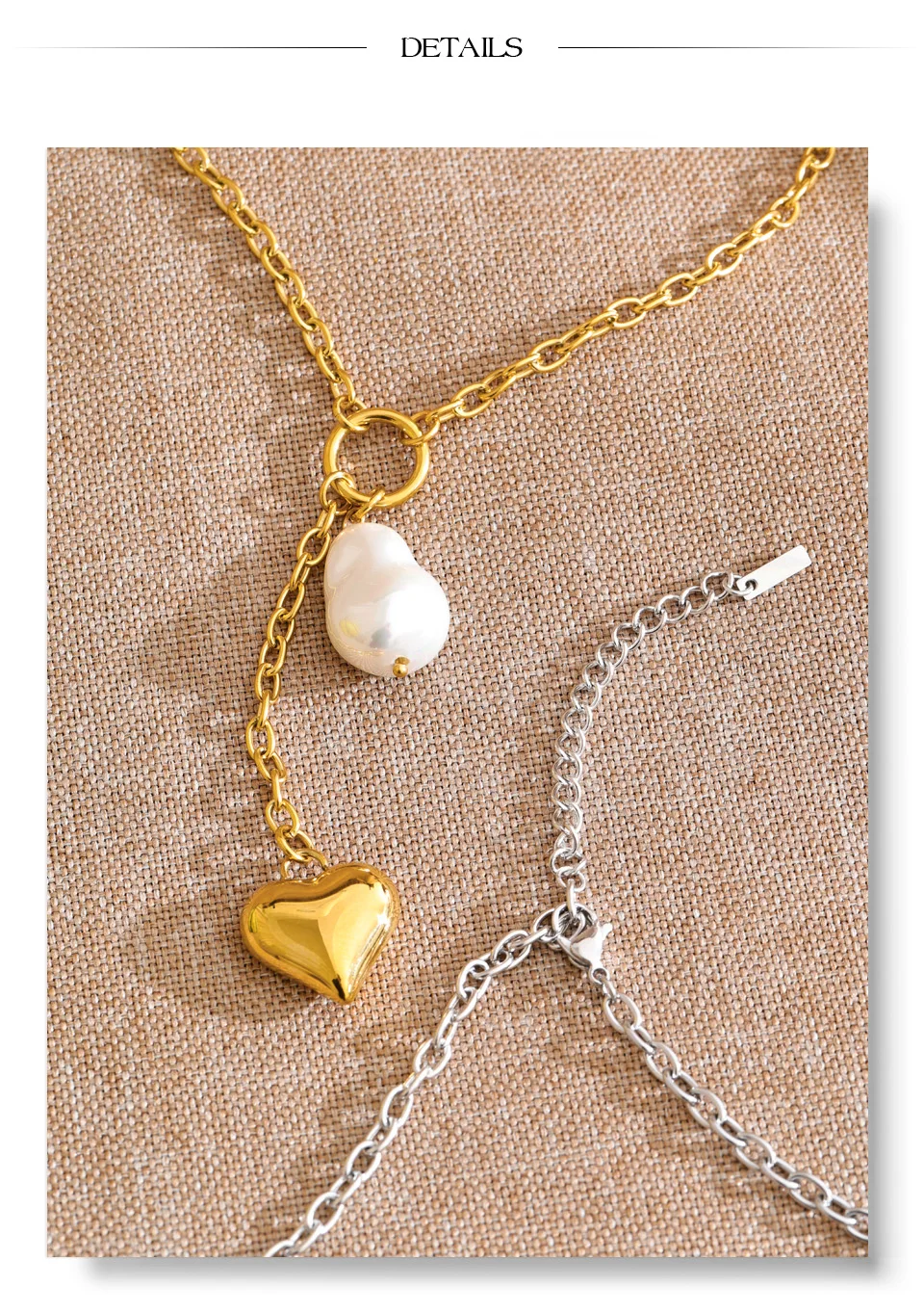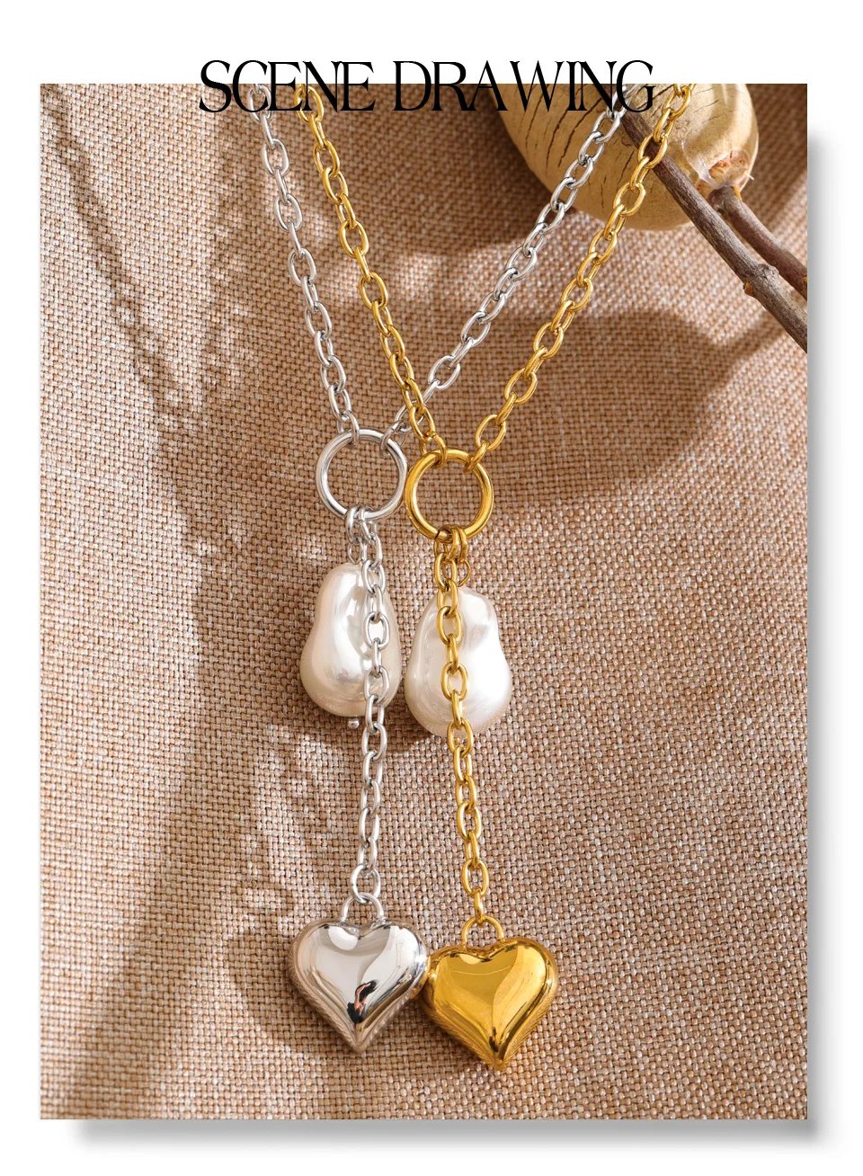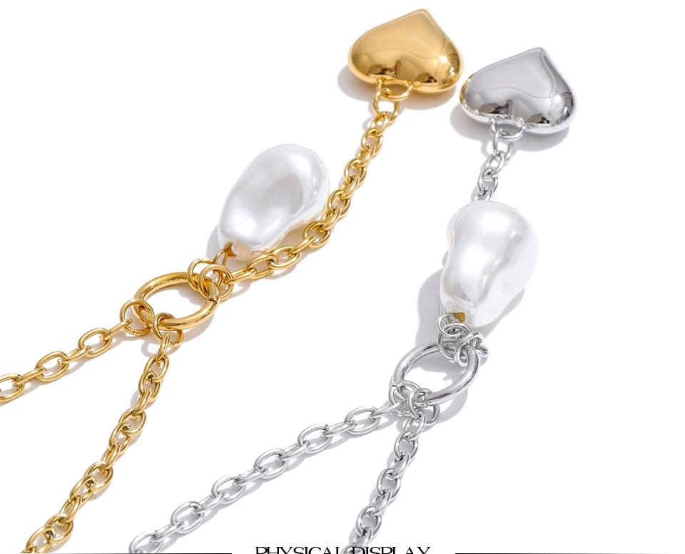 The Platinum Baroque Pearl Heart Necklace – Graceful Drama reimagines classic pearl elegance through a contemporary lens. Suspended from a refined stainless steel chain, the heart drop silhouette is enhanced by a luminous baroque-style simulated pearl — organic in shape, expressive in presence.