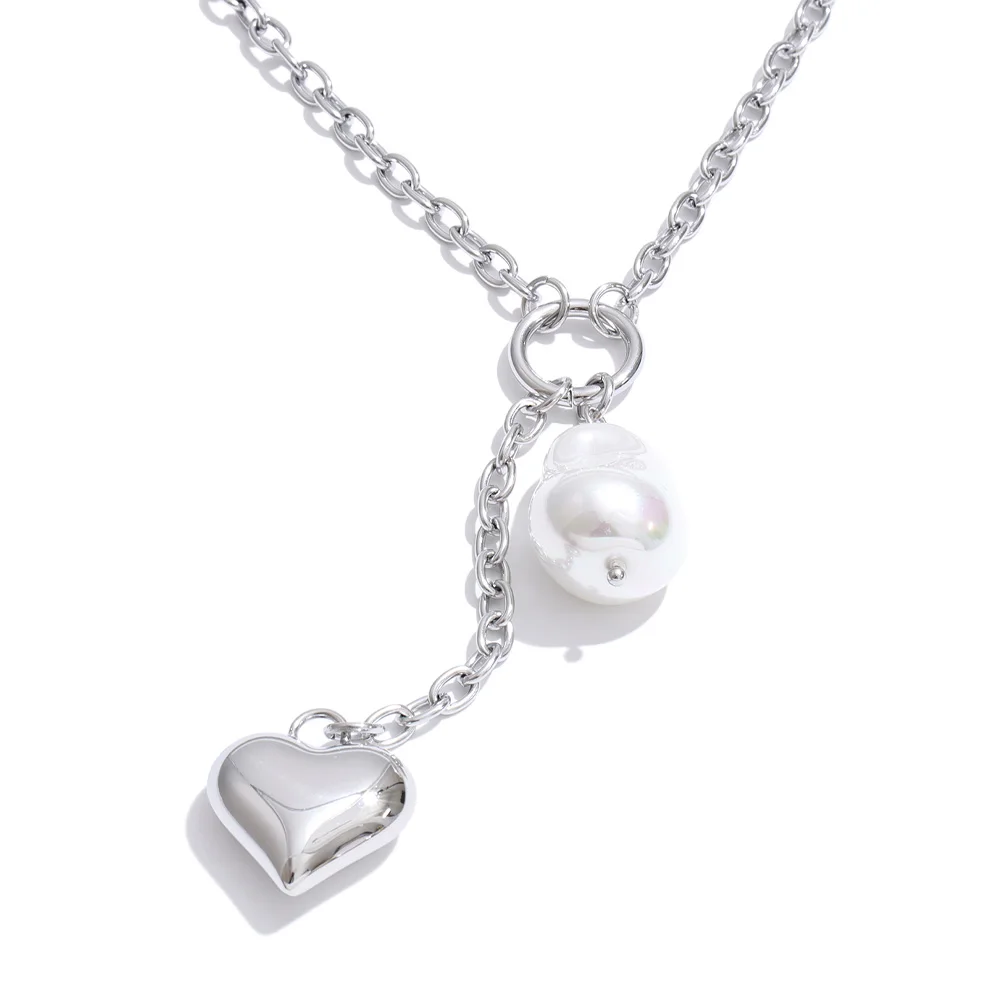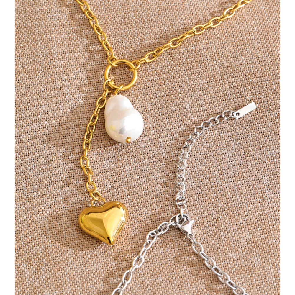 The Platinum Baroque Pearl Heart Necklace – Graceful Drama reimagines classic pearl elegance through a contemporary lens. Suspended from a refined stainless steel chain, the heart drop silhouette is enhanced by a luminous baroque-style simulated pearl — organic in shape, expressive in presence.