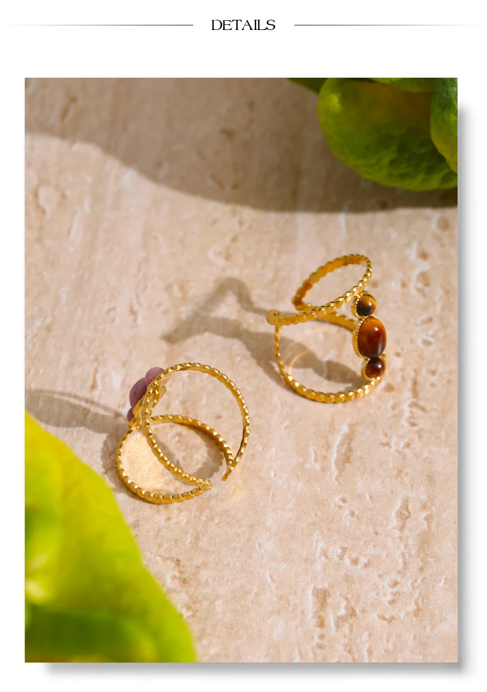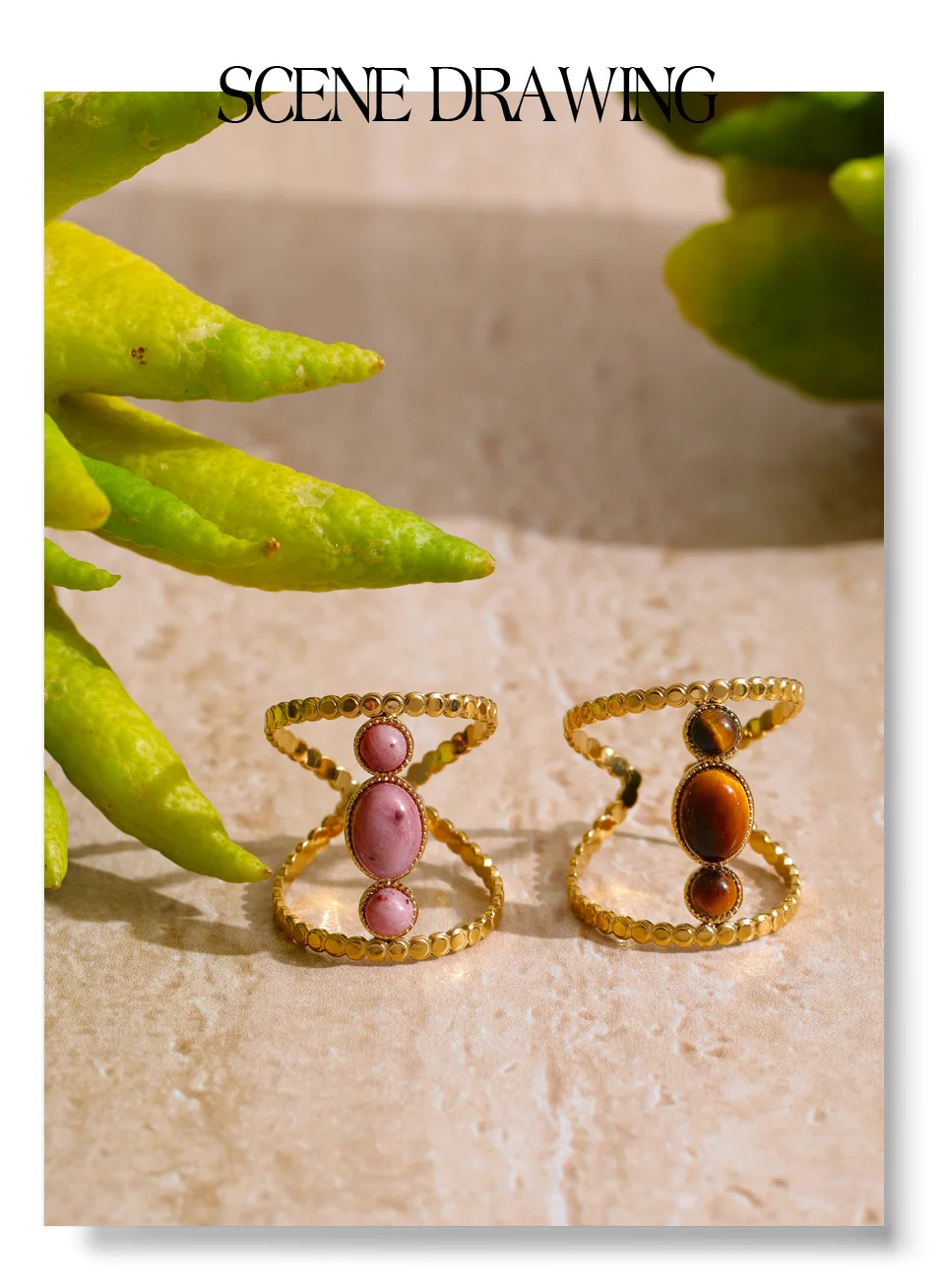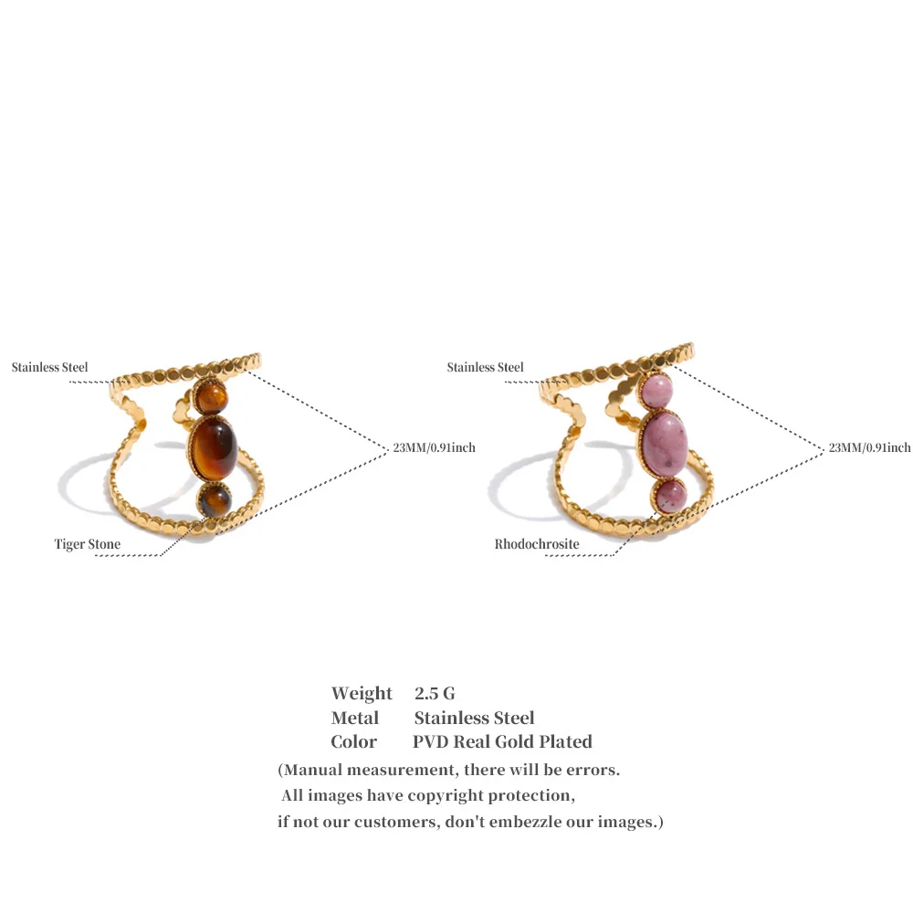 The Golden Blush Rose Stone Ring – Vertical Harmony celebrates natural beauty through architectural alignment. Three softly polished rhodochrosite stones are arranged in a vertical composition, creating a graceful column of blush-toned warmth against radiant 18K PVD gold plating.