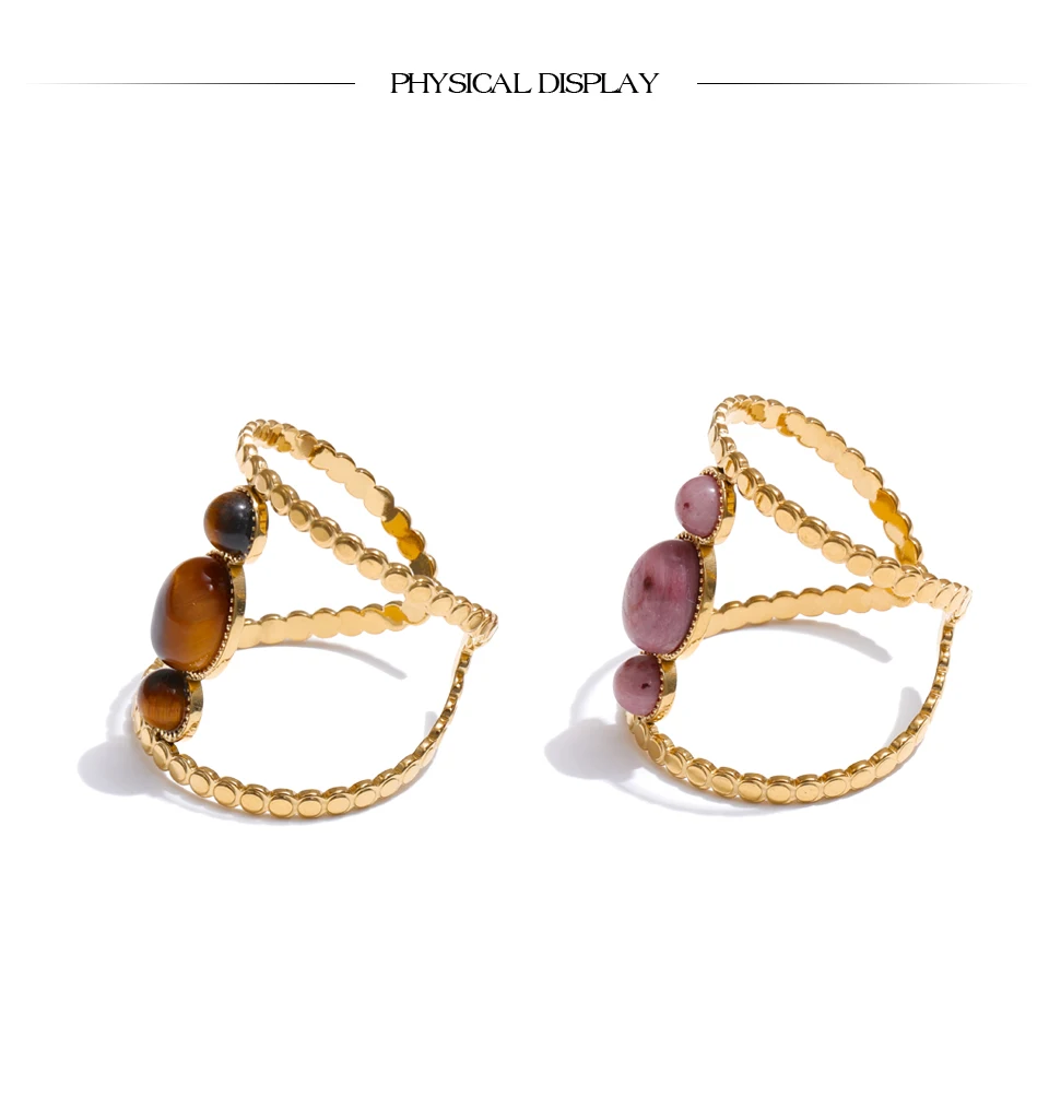 Crafted from durable stainless steel, the open adjustable structure ensures comfort while maintaining a sculpted presence. The beaded-texture band adds subtle dimension, enhancing the organic character of the natural stone centerpiece.
