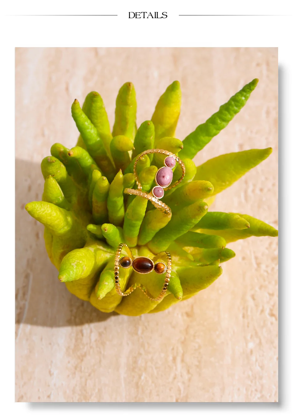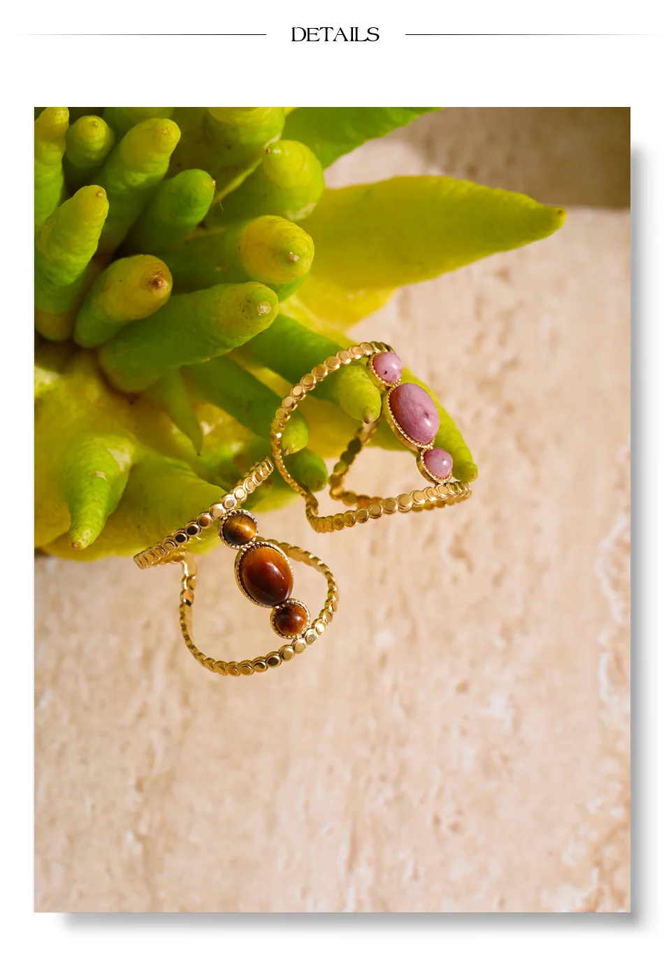 Balancing earth-born softness with structured design, this ring captures a quiet strength. The vertical arrangement elongates the finger, while the mineral tones introduce warmth and individuality to every gesture.