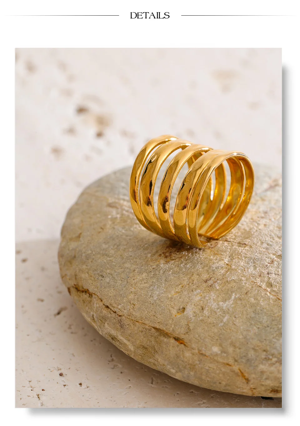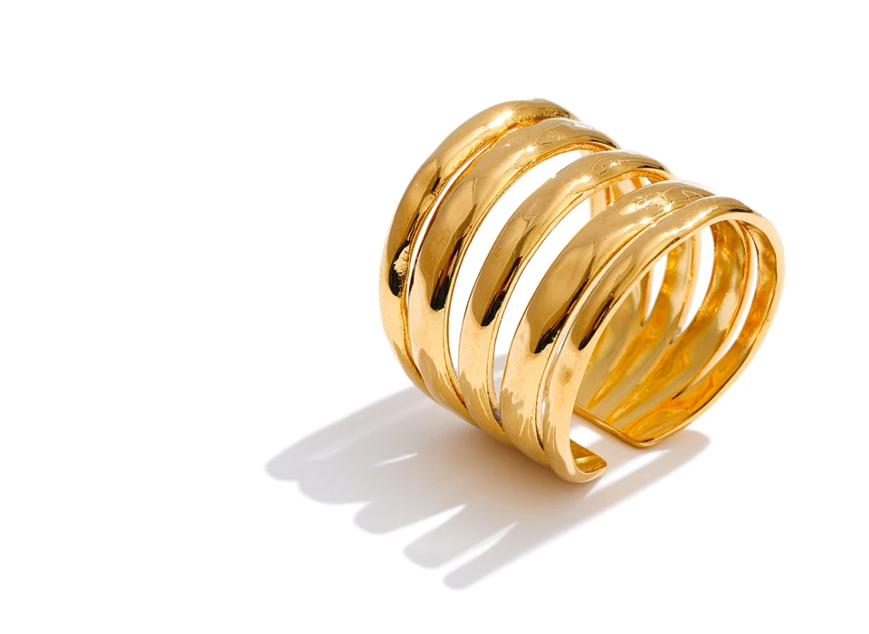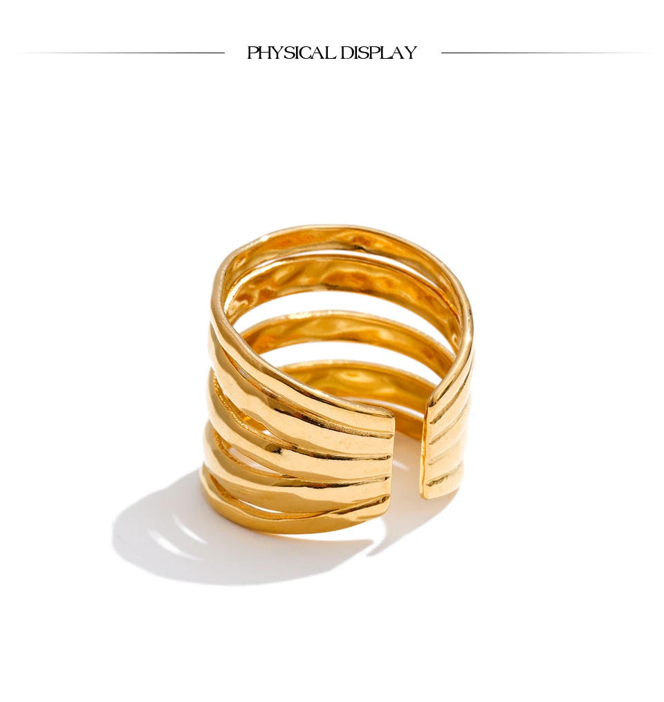 Crafted from high-quality stainless steel and finished with 18K PVD gold plating, this ring is durable, tarnish-resistant, and designed to maintain its radiant shine. Its polished surface reflects light beautifully, emphasizing the interplay of layers for a refined yet bold statement.