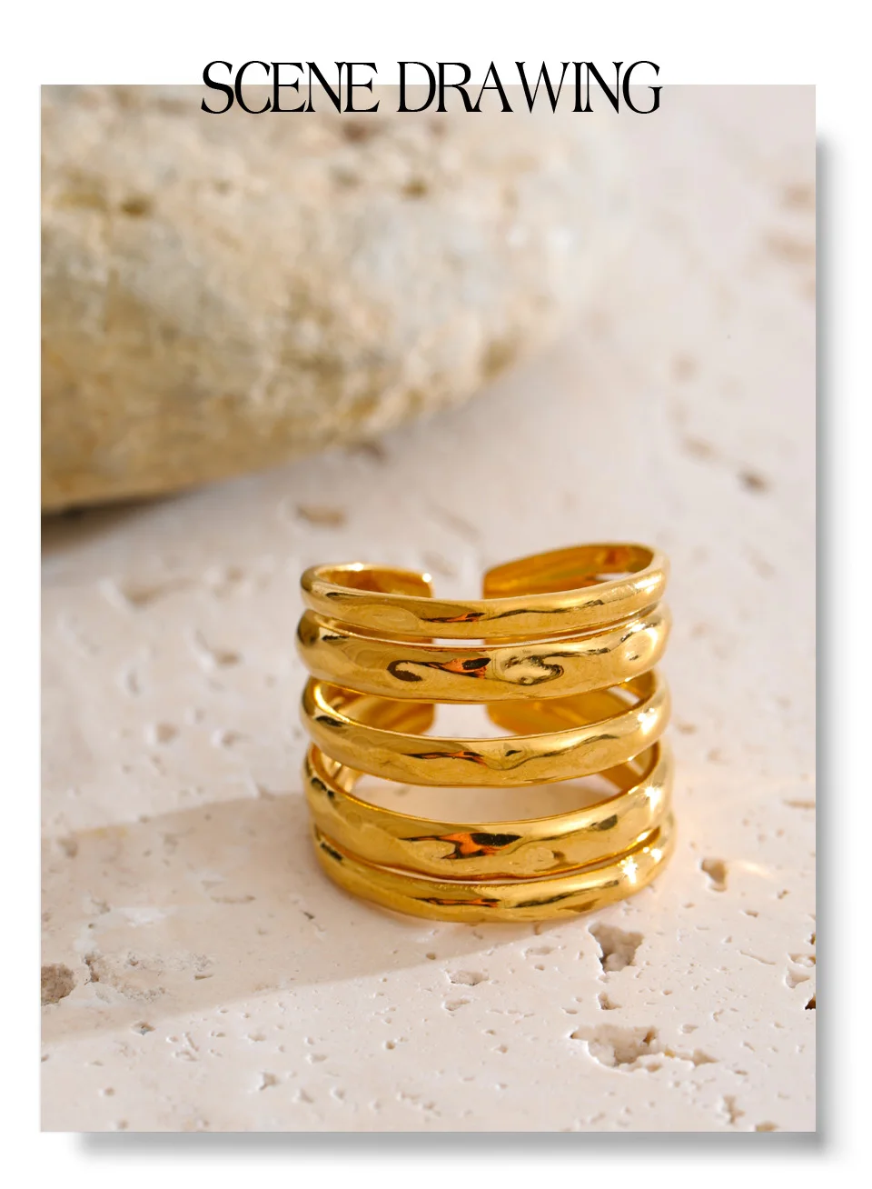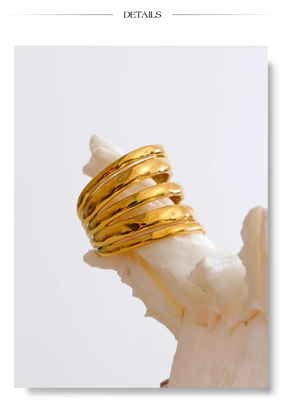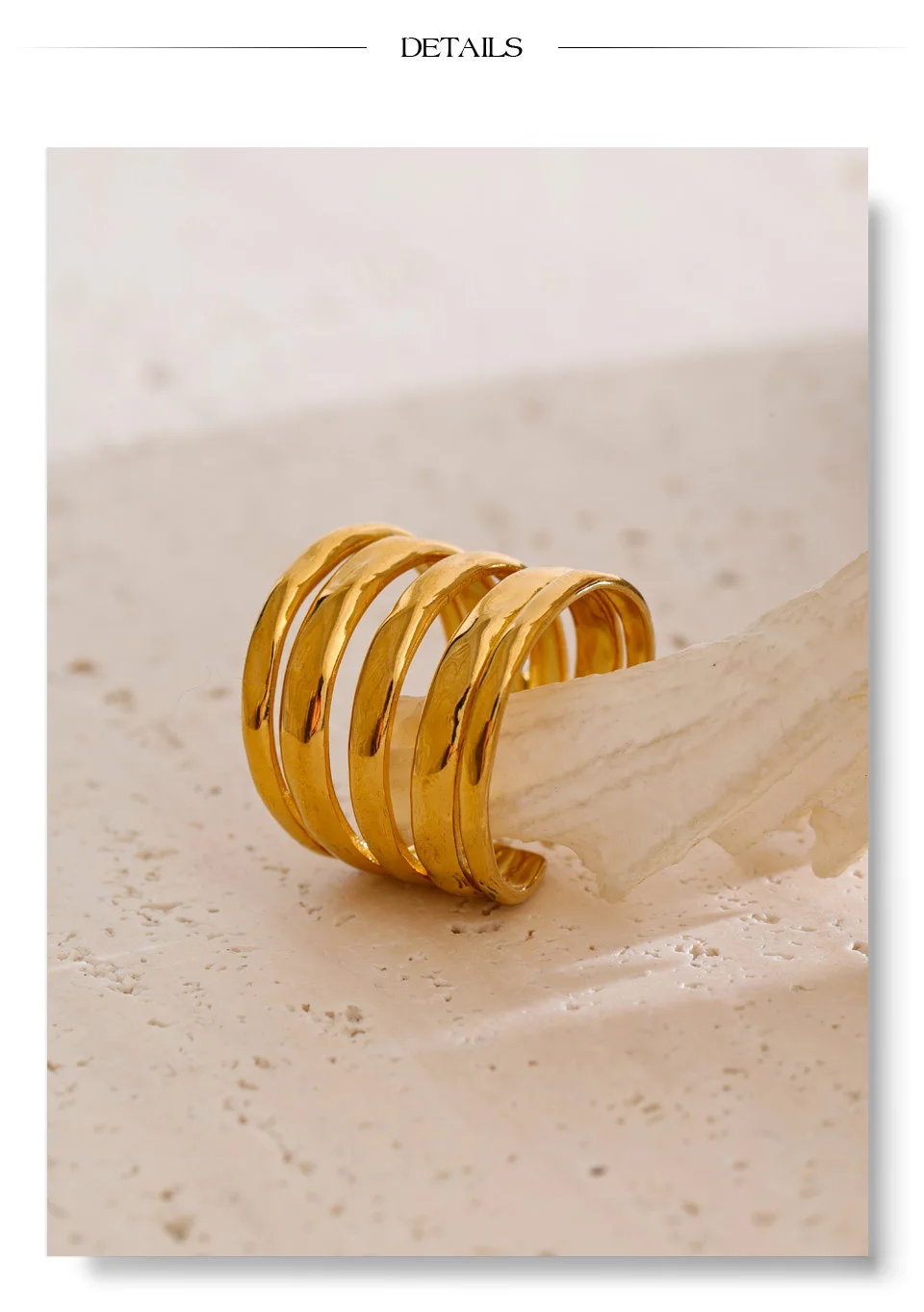 Crafted from high-quality stainless steel and finished with 18K PVD gold plating, this ring is durable, tarnish-resistant, and designed to maintain its radiant shine. Its polished surface reflects light beautifully, emphasizing the interplay of layers for a refined yet bold statement.