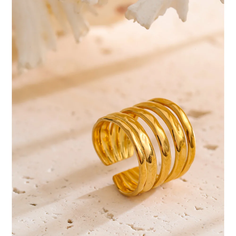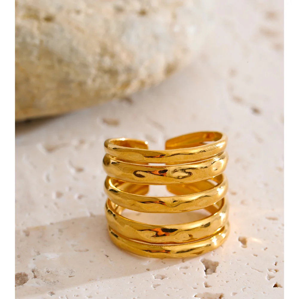 Crafted from high-quality stainless steel and finished with 18K PVD gold plating, this ring is durable, tarnish-resistant, and designed to maintain its radiant shine. Its polished surface reflects light beautifully, emphasizing the interplay of layers for a refined yet bold statement.